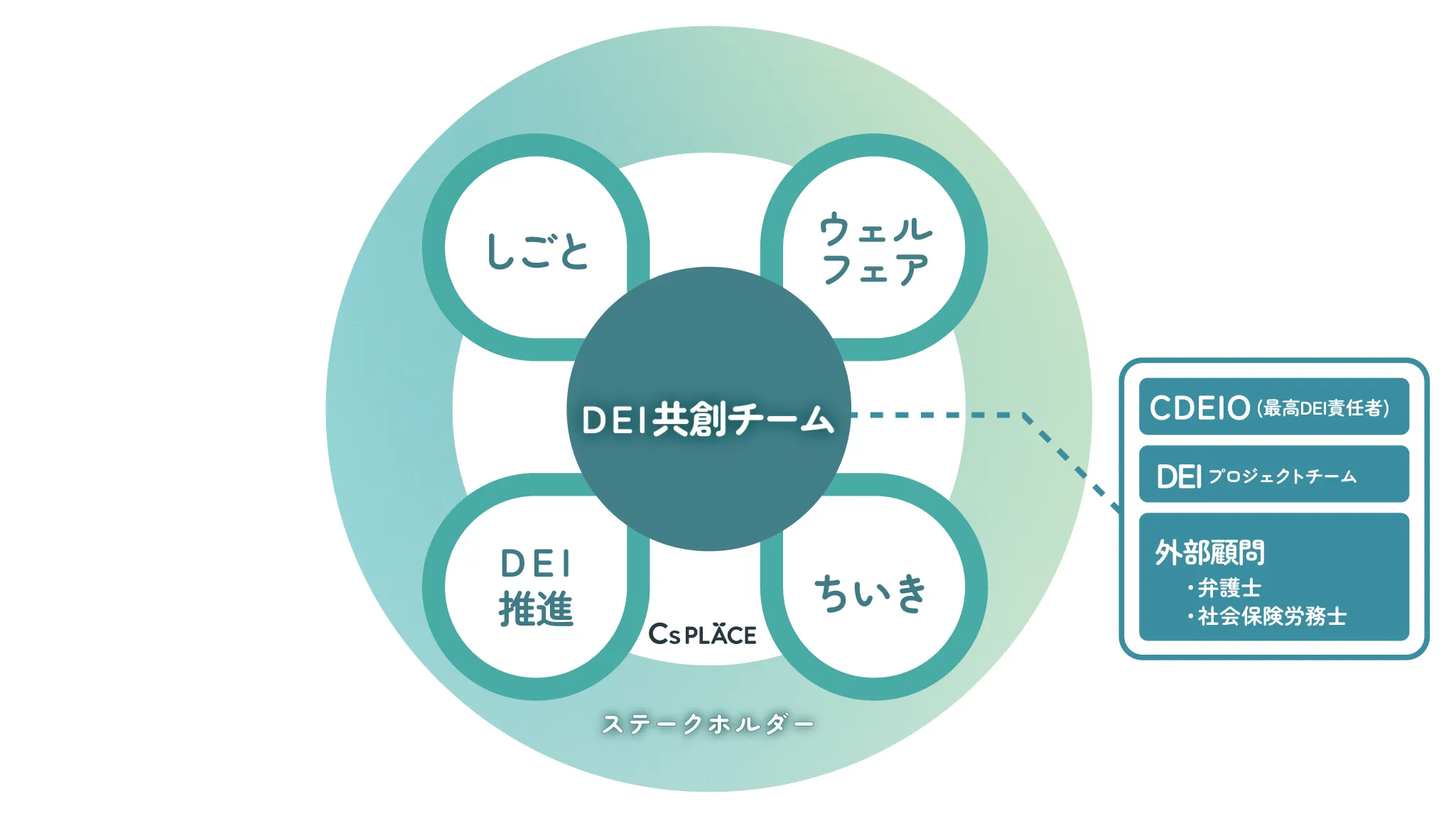 DEI とは、Diversity(多様性)Equity(公平性)Inclusion(包括性)の頭文字を組み合わせた略称です。シーズプレイスでは事業横断共創チーム「ダイバーシティ・サポーターズ」を形成し、すべてのサービスでDEI 視点を取り入れたサービスを提供しています。