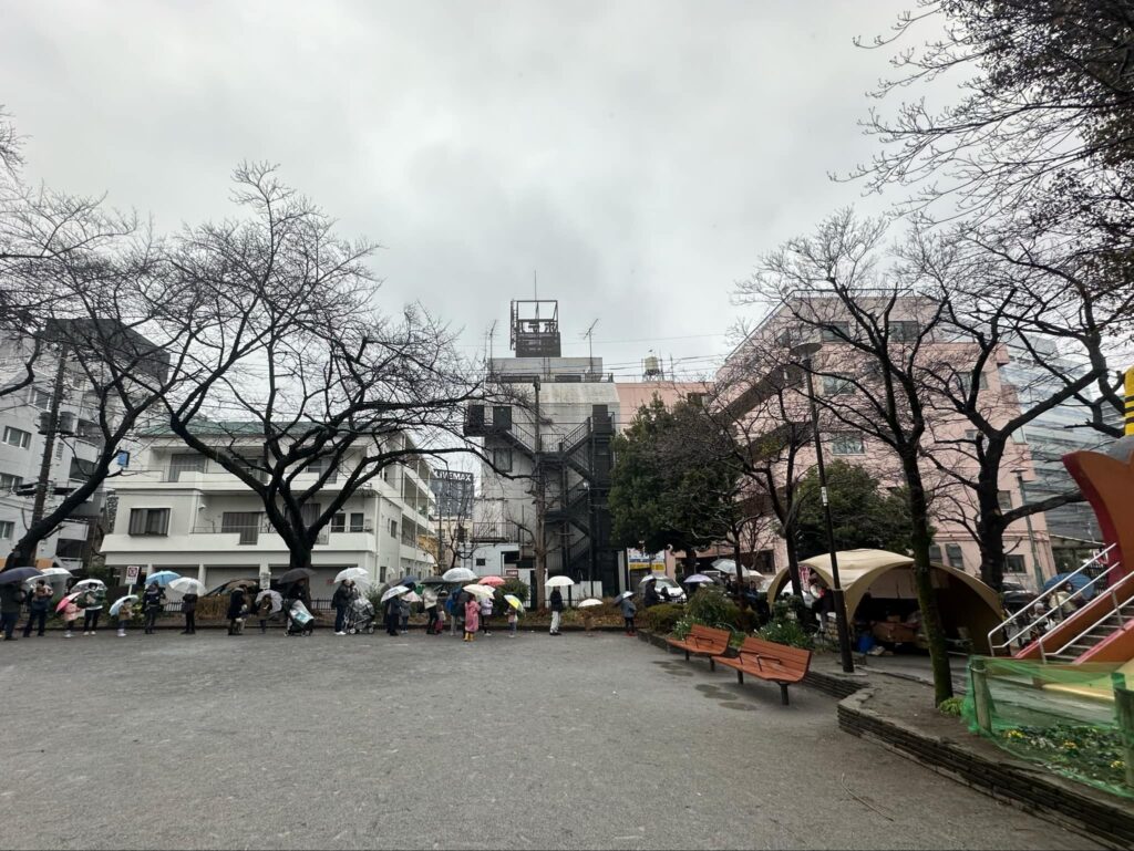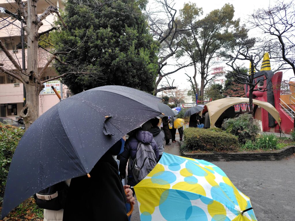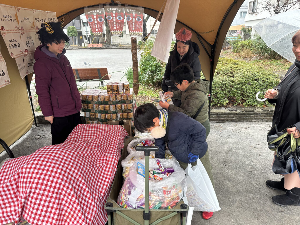 雨でお菓子はまけなかったため、お菓子つかみ取りに変更し実施。生憎の雨にも関わらず、ピーク時は行列ができました!