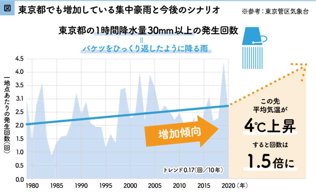平均気温が4℃上昇すると、その回数は1.5倍まで増加すると予測されています。