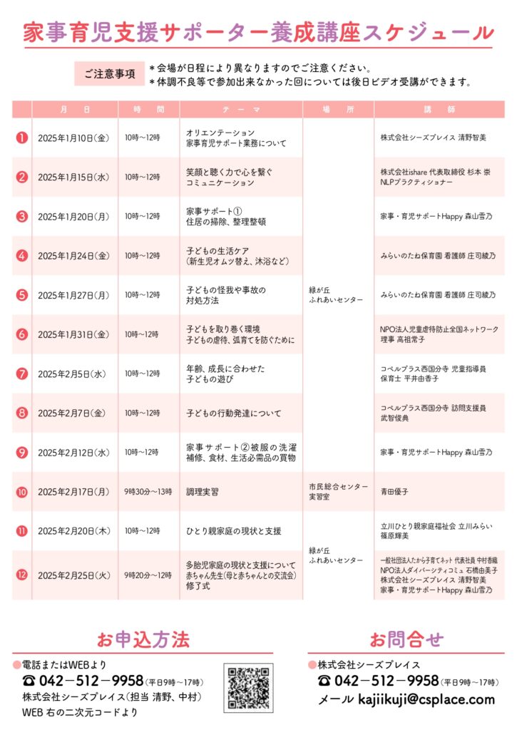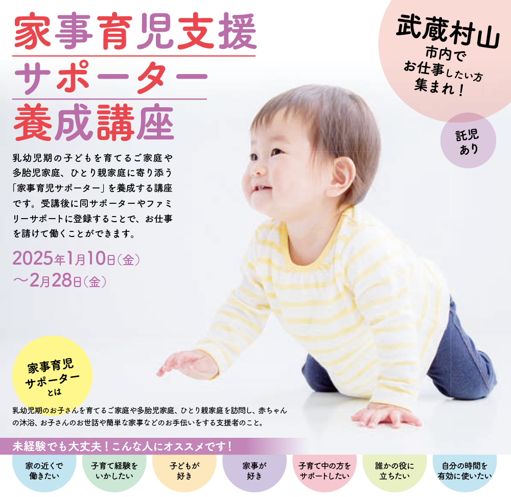 乳幼児期の子どもを育てるご家庭や多胎児家庭、ひとり親家庭に寄り添う家事育児サポーターを養成する講座です。1月から計12回の講座を受講したのちに、サポーターとしてお仕事をうけていただきます。