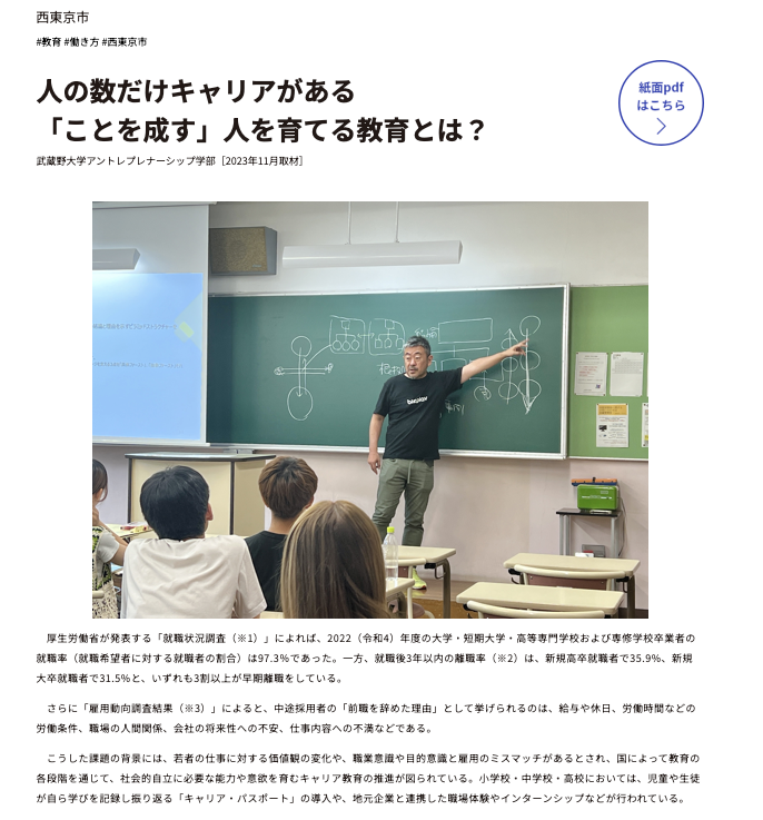 もう一本は、「人の数だけキャリアがある 「ことを成す」人を育てる教育とは?」として、「広報たまちいき」過去号より「武蔵野大学アントレプレナーシップ学部」を紹介。