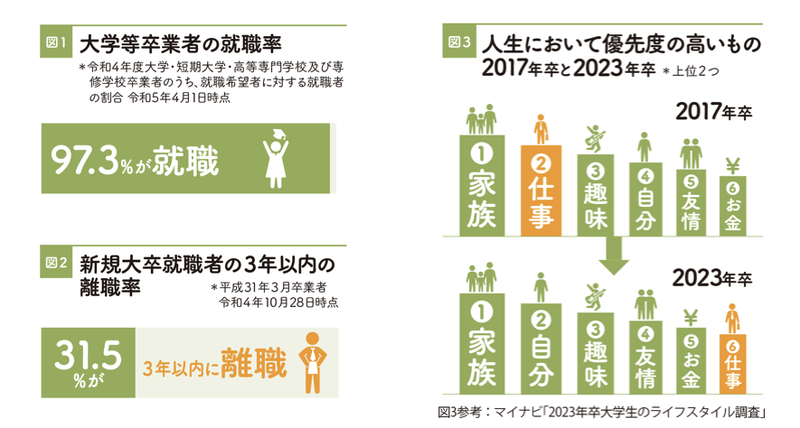 近年増えている若者の早期離職の背景には、若者の仕事に対する価値観の変化や職業意識や目的意識と雇用のミスマッチがあるとされ、社会的自立に必要な能力や意欲を育むキャリア教育の推進が図られています。