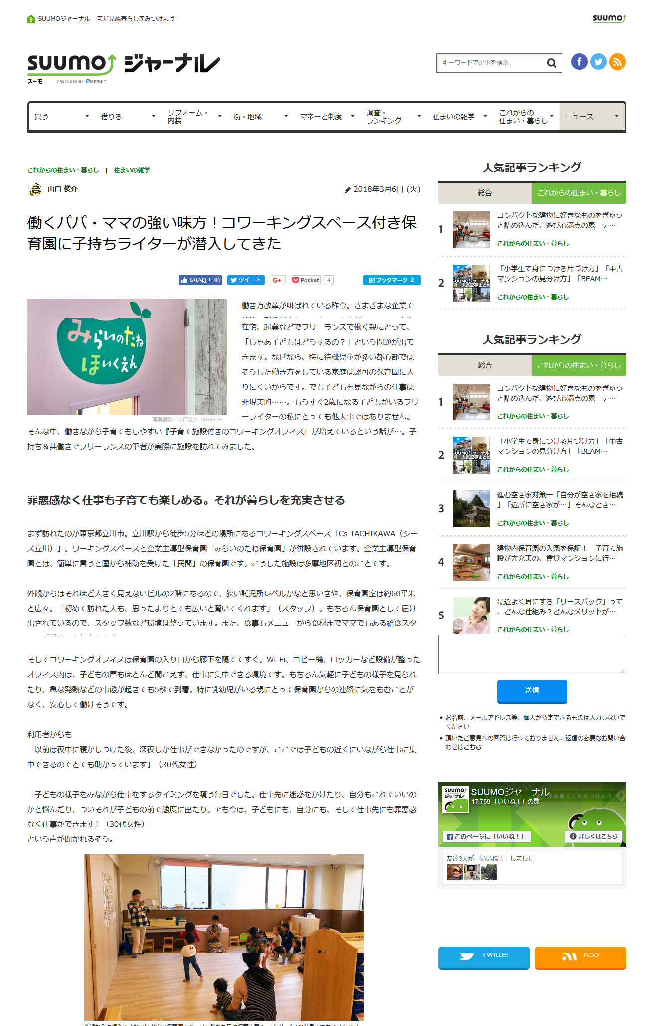 2018.09.03 メディア SOOMOジャーナルに掲載されました 「CsTACHIKAWA」が、住まい・暮らしのニュースやコラムなどを毎日配信するサイト「SUUMOジャーナル(スーモジャーナル)」に掲載されました。 >くわしくはこちら 一覧へ戻る