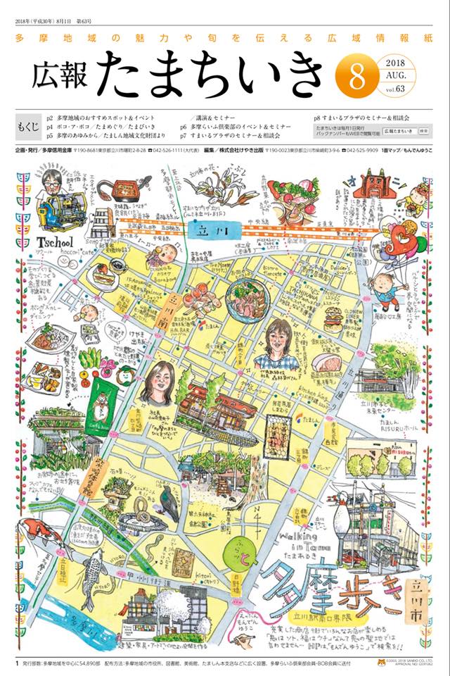 多摩信用金庫さん発行のフリーペーパー「広報たまちいき」8月号の表紙「多摩歩き・立川南特集」のイラストマップに掲載していただきました。