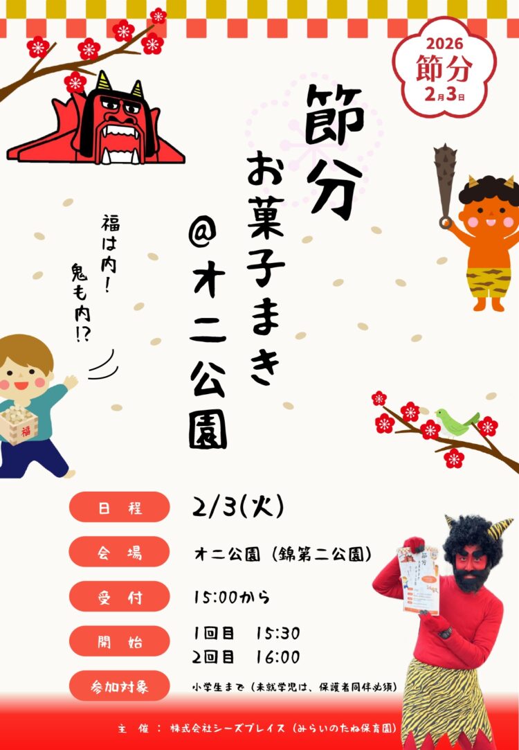 節分お菓子まき@オニ公園は、節分の日にオニ公園(錦第二公園)で、映画等を通じて地域のランドマークにもなっている「大きな鬼の滑り台」の上から子どもたちにお菓子をまくイベント!